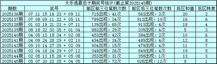 体彩大乐透第25145期奖号开出:05 07 20 22 25+04 05,前区奖号大小比为3:2,012路比为0:3:2,奇偶比为3:2,后区号码和值为9,跨度为1。