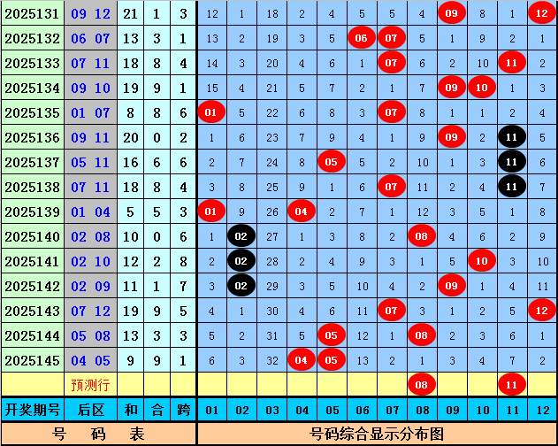 后区号码分析:上期后区开出奖号04 05,和值为9,跨度为1,本期后区参考号码04、06、08、10、11。